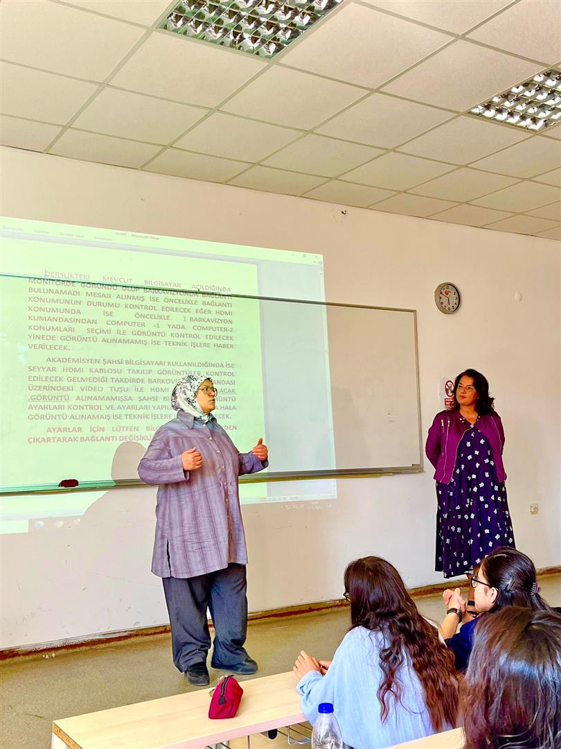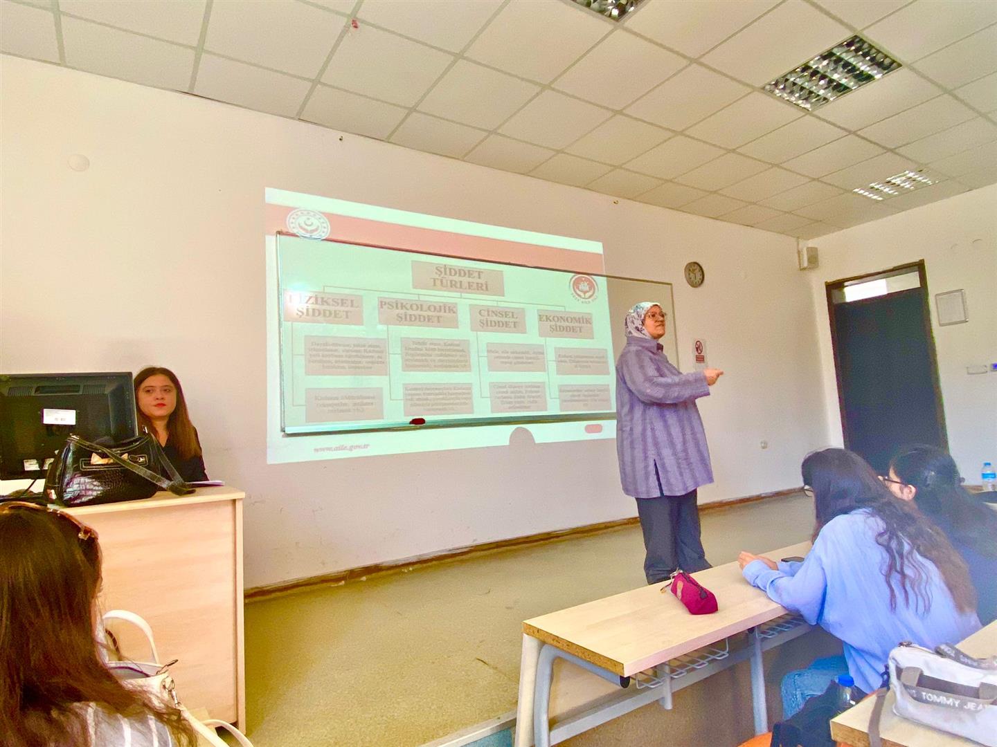 Bölümün halen yüksek lisans öğrencisi olup, Çankırı ŞÖNİM merkezinde kuruluş müdürü olarak görev yapmakta olan sosyal hizmet uzmanı Büşra ÇALIŞKAN ve bölüm personeli öğretmen Ayten CEYHAN, öğrencilerimize kurumunun çalışmaları hakkında bilgilendirme yaptılar. Programda 6284 sayılı kanun, ilgili yönetmelik hükümleri, vaka örnekleri ve kurumsal işleyiş hakkında sunum gerçekleştirildi. Konuya ilişkin bilgi aktarımı yanı sıra mesleki kariyerlerinin basamakları konusunda da öğrenciler için motivasyon sağlandı.