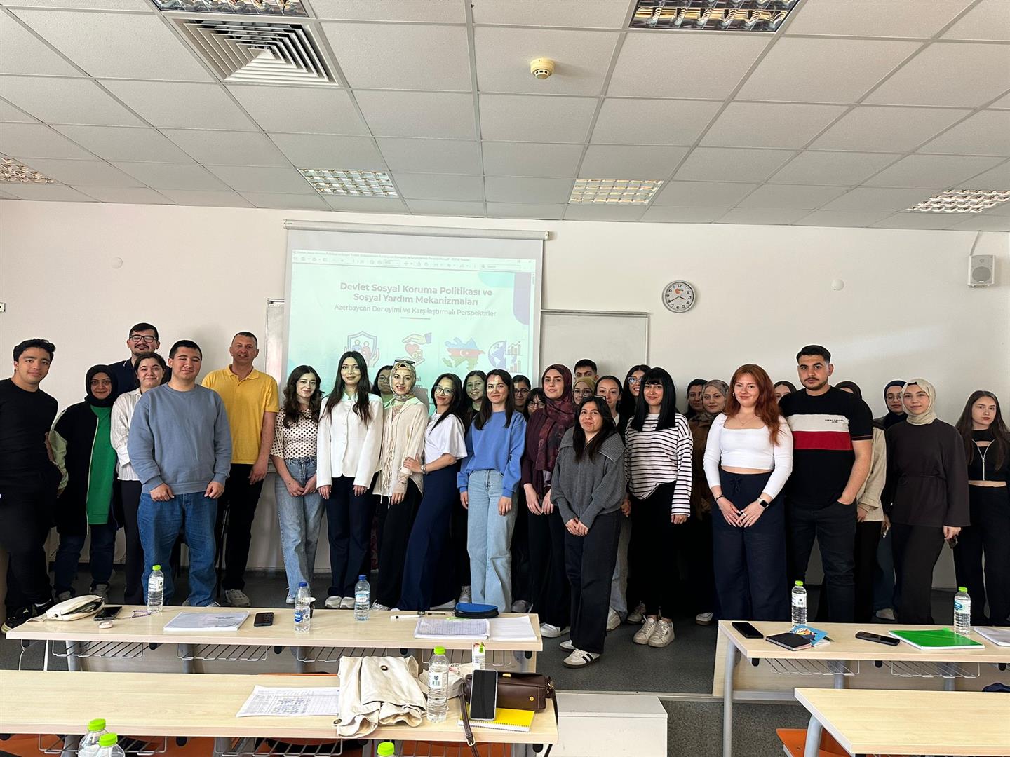Yoğun ilgi gören derste, öğretim görevlisi Afsana MURADLI, Azerbaycan’daki sosyal koruma sisteminin yapısını, sosyal yardım mekanizmalarının işleyişini ve bu sistemlerin toplumsal refah üzerindeki etkilerini detaylı biçimde ele aldı. Aynı zamanda Türkiye ile karşılaştırmalı bir bakış açısı sunarak öğrencilerimizin farklı ülke uygulamalarını analiz etmesine katkı sağladı. Ders süresince öğrenciler aktif katılım göstererek hem teorik hem de uygulamaya dönük sorular yöneltti ve uluslararası perspektifte önemli kazanımlar elde etti.